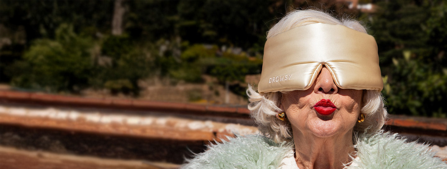 A woman with long hair lies on a white surface wearing a navy blue silk sleep mask that covers her eyes and ears. The word DROWSY is visible on the mask. She is dressed in a white shirt and a delicate necklace.