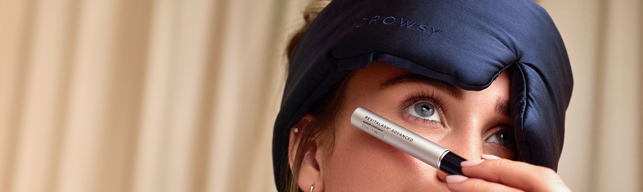 A woman with long hair lies on a white surface wearing a navy blue silk sleep mask that covers her eyes and ears. The word DROWSY is visible on the mask. She is dressed in a white shirt and a delicate necklace.